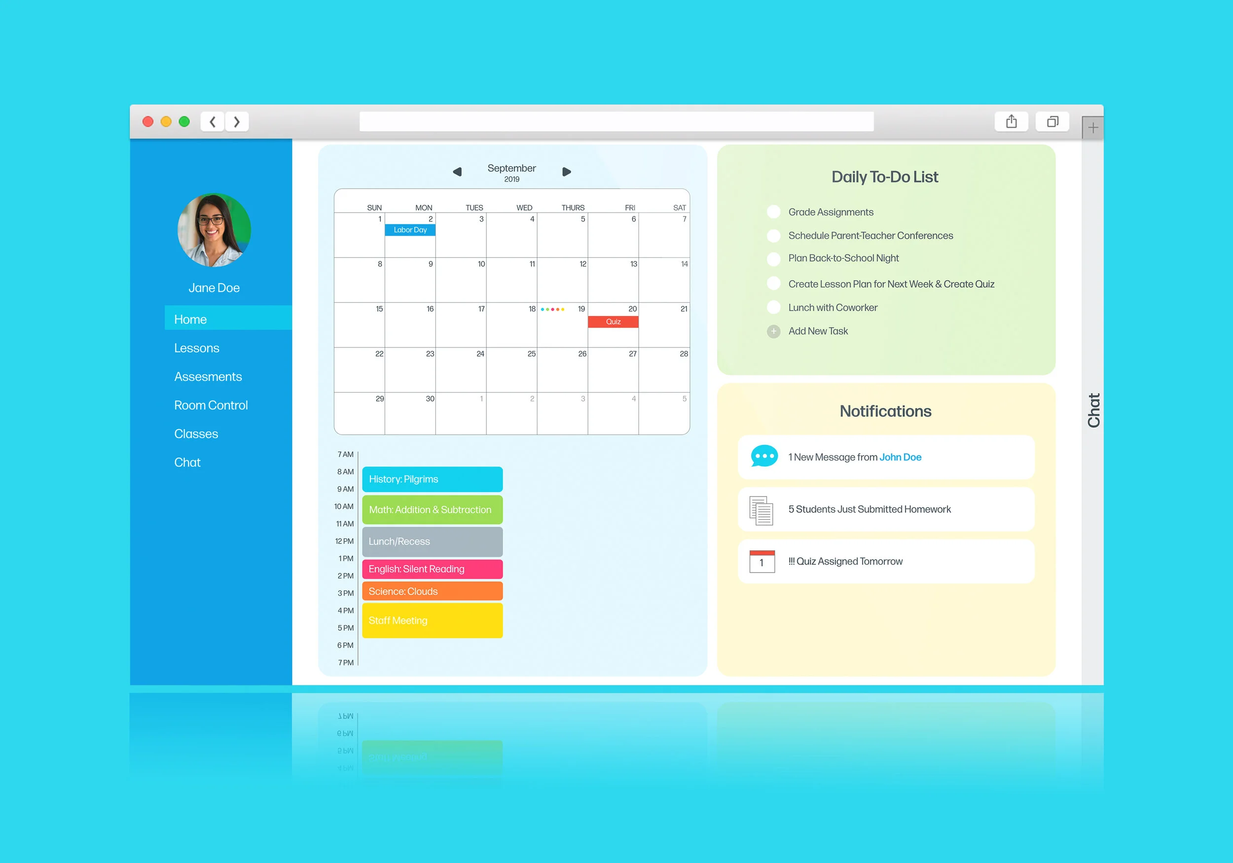 The new design presents a cleaner look with the menubar now moved to the left-hand side. The calendar is now smaller and a daily timetable is listed directly under it so teachers can view everything they have schedule on that particular day. Furthermore, the notifications have been cleaned up and only lists the most recent activity. This design also allows teachers to customize their home pages because the blocky sections are intended to be widgets. This means that they can remove or add a calendar, to-do list, etc. if needed.