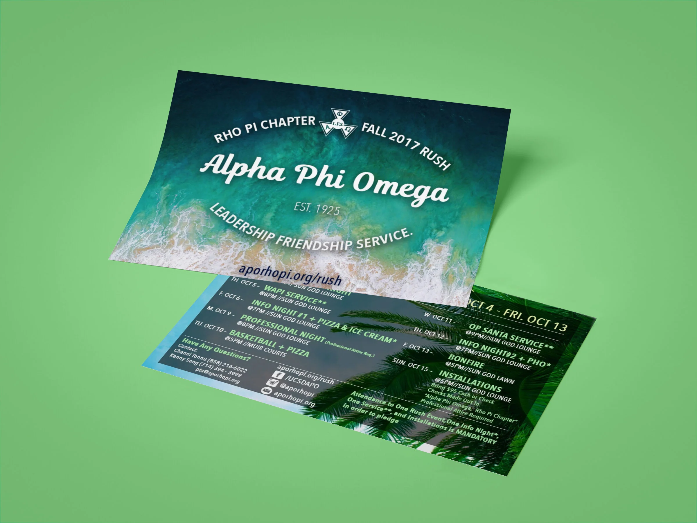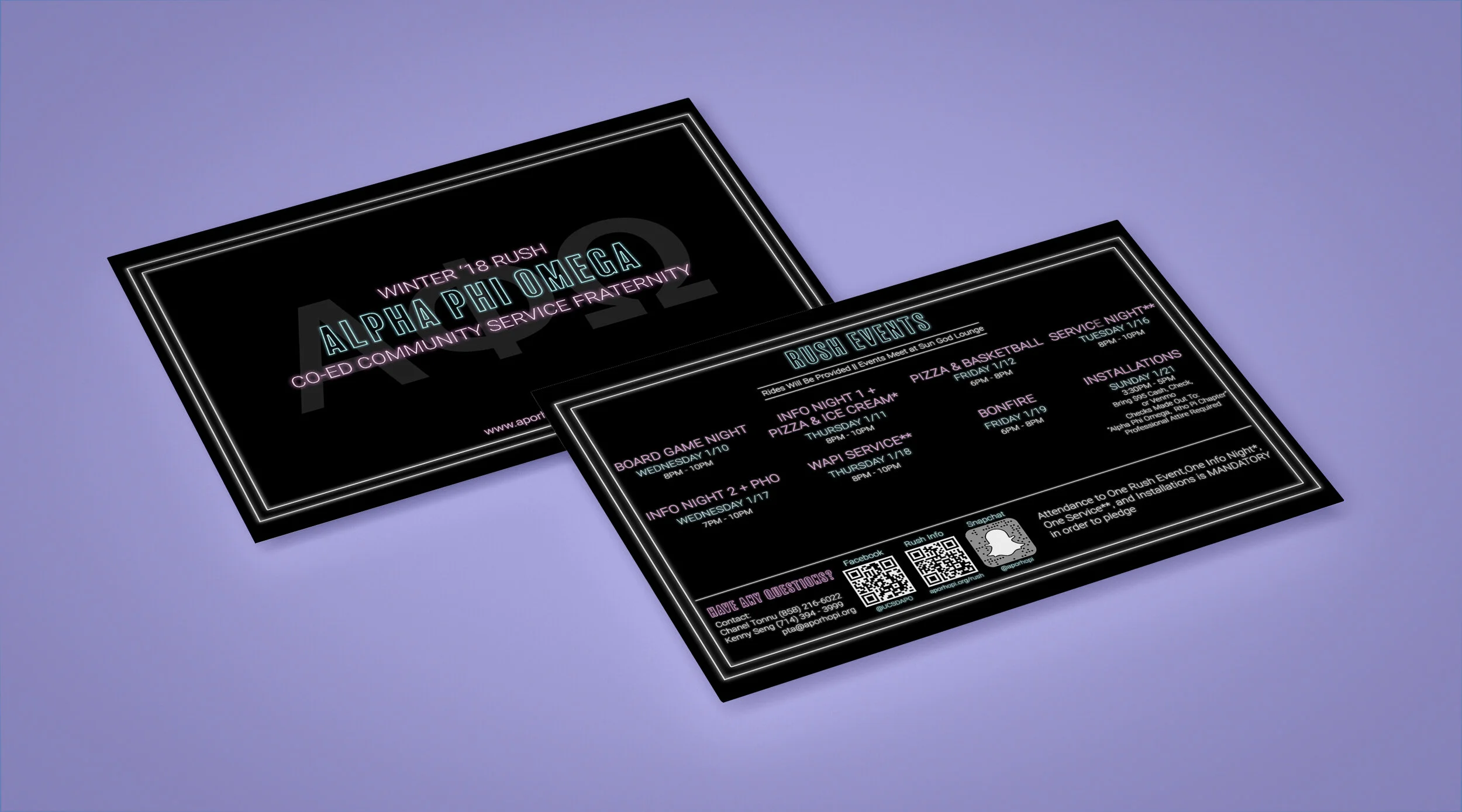 Alpha Phi Omega — Rho Pi Chapter — is a community service fraternity at UC San Diego. From Spring 2017 to Spring 2018, I served as the publicity chair for the chapter. I designed flyers, created Snapchat geotags, and utilized social media to promote the organization during recruitment.